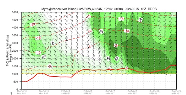 - Canada RASP- This site was created by a paraglider and provides two visualizations from the HRDPS model. One is a map that primarily shows information about wind at different elevations, and the other is a ‘windgram’ which shows wind and temperature at a single location as a function of altitude over the next one or two days. This windgram also shows atmospheric stability, which can give an indication of enhanced or convective precipitation (especially in the spring!)