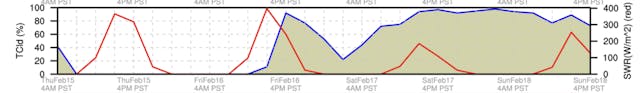 The blue line here shows the percentage of cloud cover. You can use his with the relative humidity data to get an idea of cloud heights and layers.