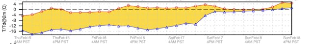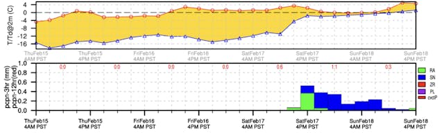 There are also (SNL/PT) versions of point and group meteograms that provide additional information about snow level and precipitation type. While this can be useful, the additional information sometimes makes it more difficult to see trends.