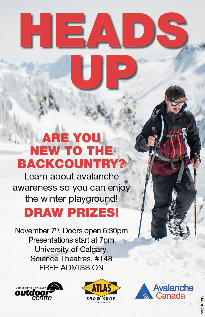 Learn about the basics of avalanche safety so you can enjoy your winter adventures at this free event on November 7 at U of C. Meet like minded people and talk to other outdoor clubs. Presentations from our avalanche forecaster, K-country public safety, U of C outdoor programs and an author and prolific snowshoer who knows the local snowshoe scene.