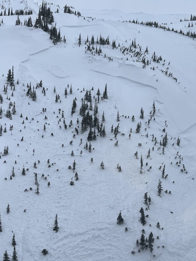 Avalanches connect across various slopes. Image from the Purcells, February 11. Read the MIN.