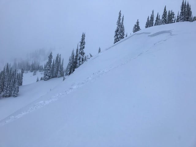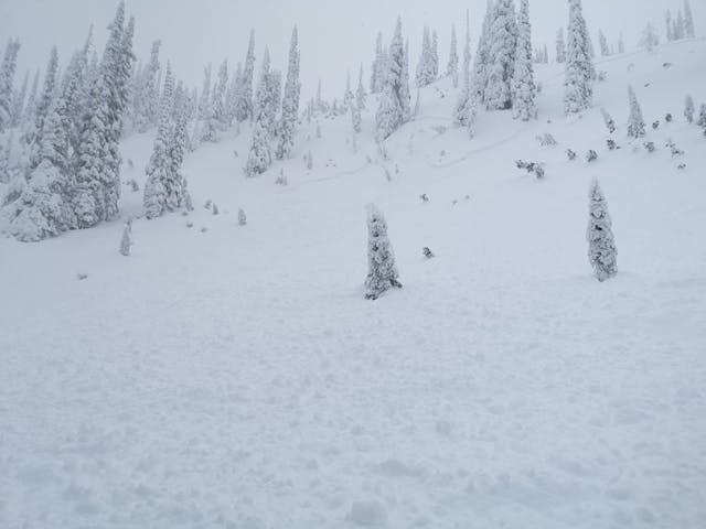 Small avalanches like this one were noted from the South Coast and parts of the Columbias earlier in the week. As storm snow amounts continues to increase, so too does the expected avalanche size. Image: TANNER ROSS
