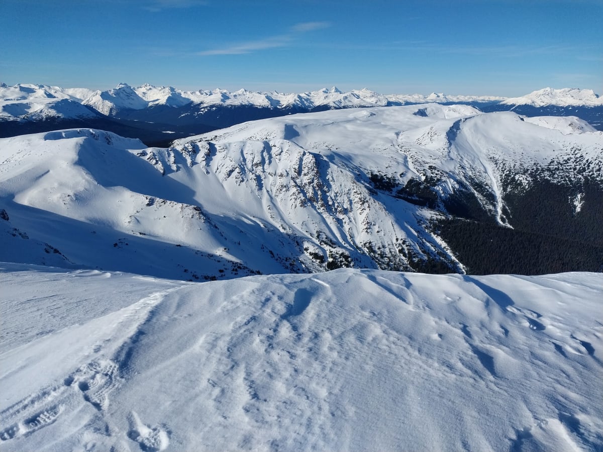 We had a beautiful sunny day sledding at Microwave Ridge. The hard snow let us travel far and with the low avalanche hazard, we felt comfortable accessing bigger terrain. We checked out the view by the repeater, then dropped into Sugar Bowl and Sun Pit. Treeline terrain still had soft snow over hard snow that made for fun turns. We had great Alpine views and did not see any new avalanches. Feathery surface hoar was growing right up to ridge crest which we'll be mindful of when it snows again.
