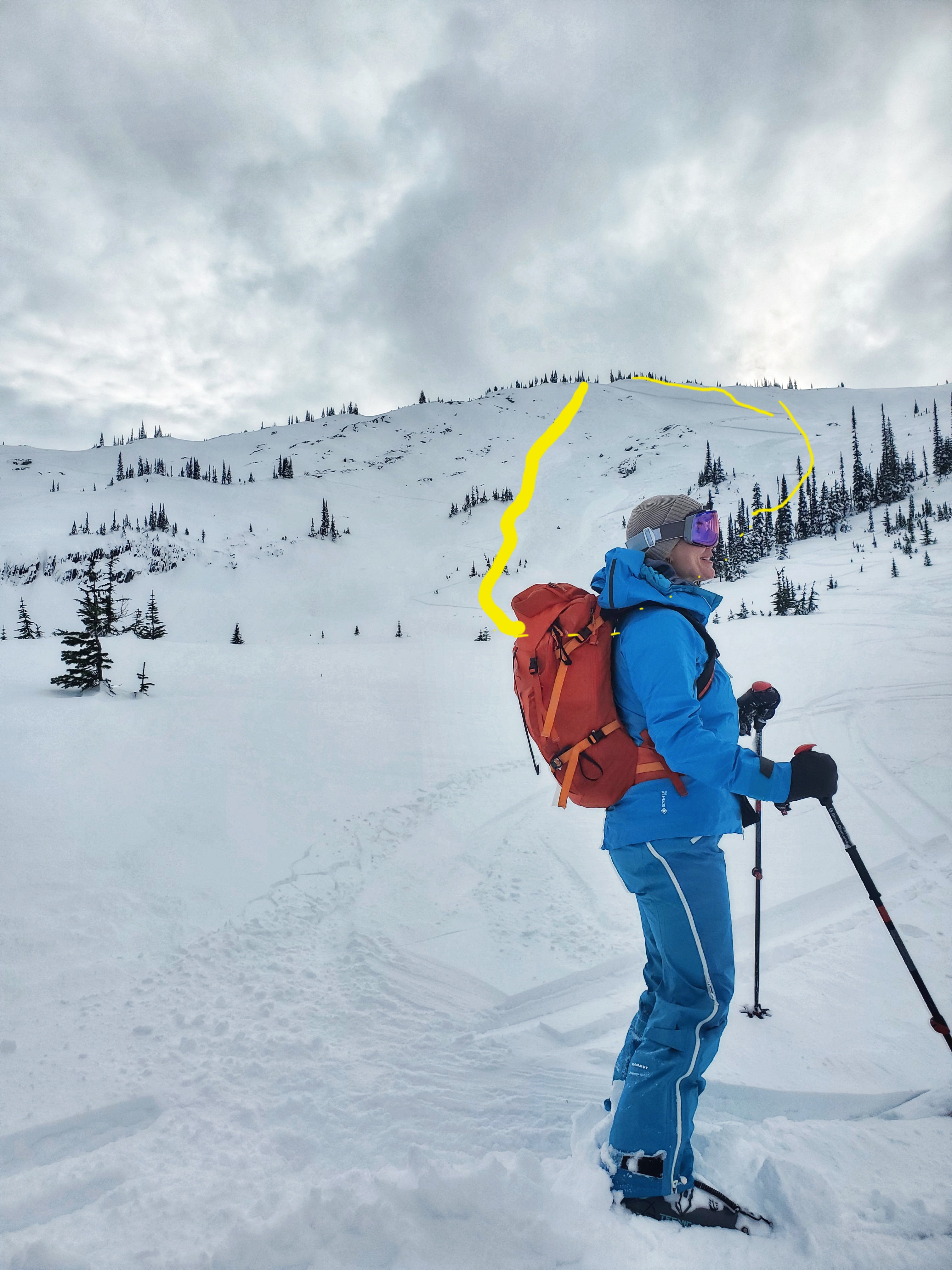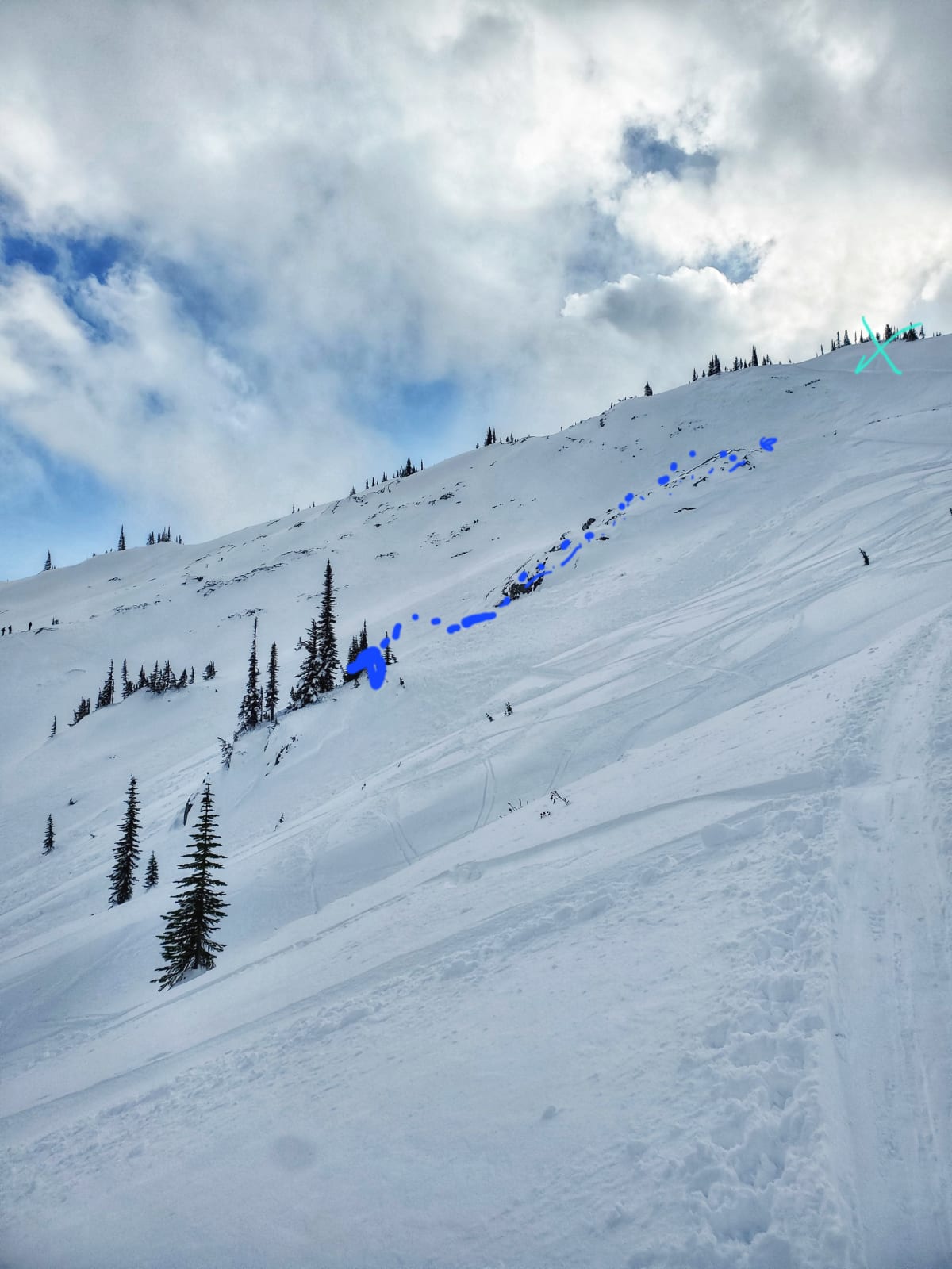 Skier 1 dropped in just below Balu Pass (NE facing) where its steepest and a bit rocky. Looks wind loaded. He stopped on top of the rocky cliffy bit (top of dark blue spot). Skier2 (teal x) dropped in, triggered the slope and skier 1 went for a ride over the cliff, came to a stop 50 to 100m lower. Half buried, had pulled his avi bag, and wasn't injured beyond bruises. He lost a ski. The crown is 1-2 feet, at least 50m wide, and it ran to where it flattens out. Small slope, but skier 1 was lucky to not get hurt in the cliffs or trees.