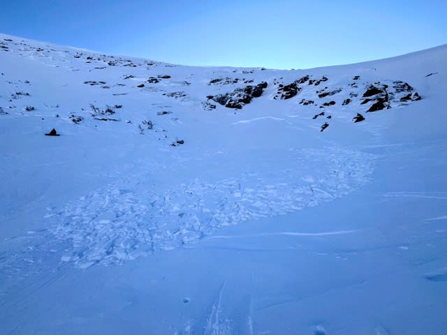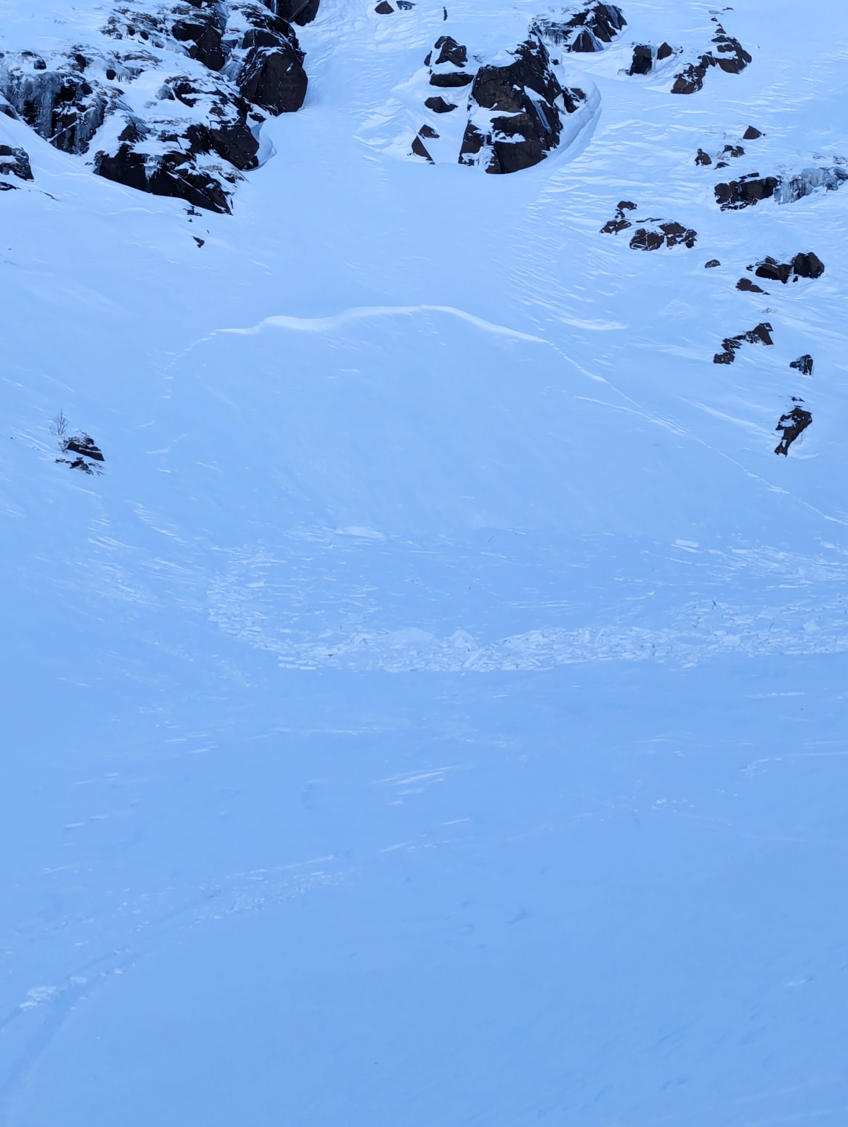 Petite avalanche size 1 dans le bas de la grande cuve. L'avalanche a été déclenchée par un skieur en bas de la pente et la neige a décroché en haut de la pente. 1 skieur impliqué. Aucun blessé.