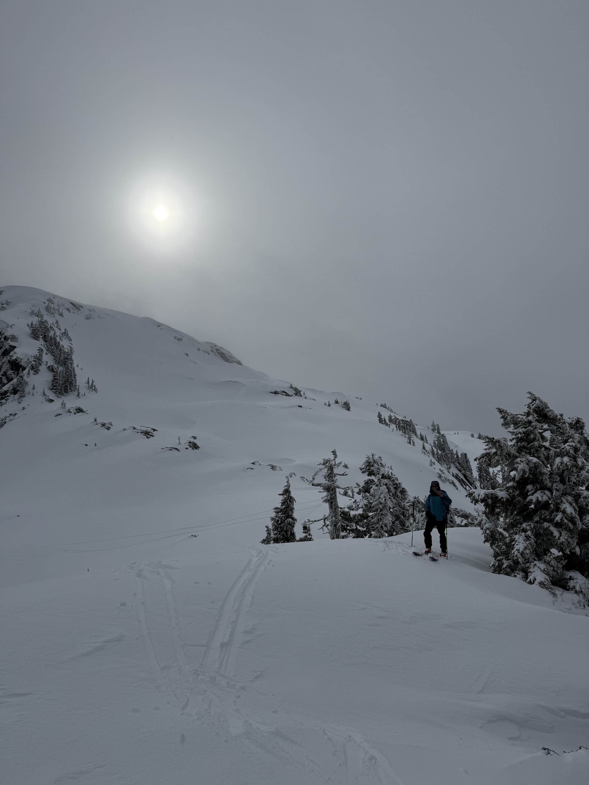Skiing was a bit variable due to wind deposits, soft and light in sheltered areas, but more inconsistent where the wind had moved things around. As temps warmed into midday, the snow got a bit heavier.