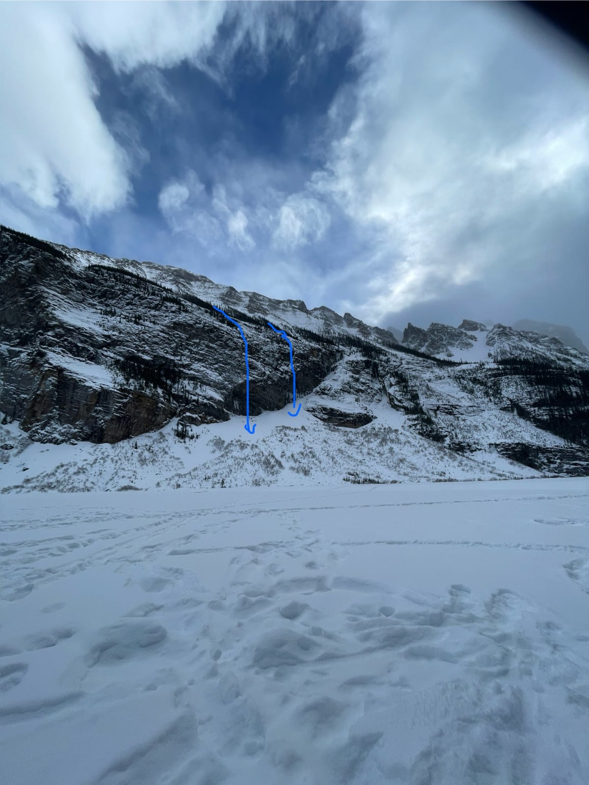 Daytime temperatures increased from -5 at 10:30 am to +4 by 3pm at the Lake Louise Shoreline Parking Area. There was a slight breeze in the am, tapering off in the afternoon. Of note, the avalanche rating in alpine was moderate, the next avalanche gully over to lookers right of the two natural avalanches is above the mixed route Dark Nature, climbers were on the upper mixed pitches when the avalanches in the gullies to the left of it occurred at 1:35pm; hope they get down safely and that gully does not go too today! Perhaps the next few days are good to steer clear of that type of terrain if about the region.