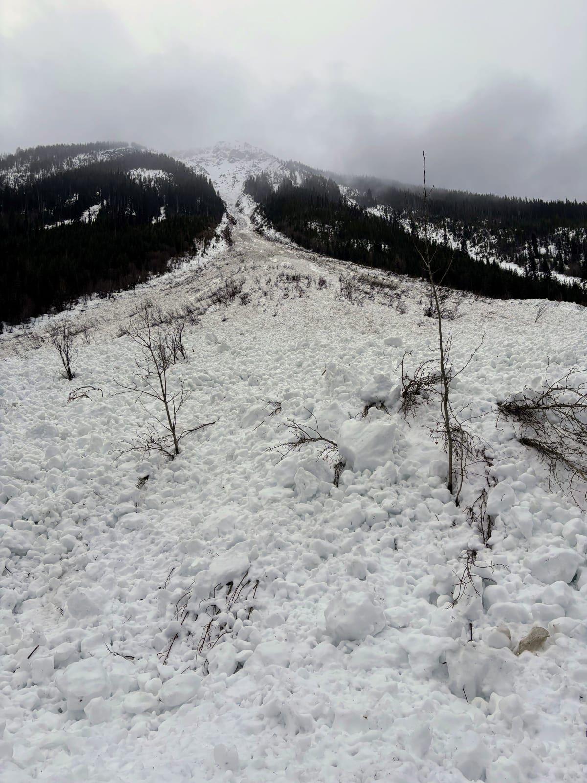 Tried to get into Jumbo Hut this morning but were greeted with significant avalanche debris covering the sled road in. Every single path along the way has slid to ground in the last few days. Temps were 1 degree at 11 am at the sled drop off area and 6 degrees by the time we got back around 1:30pm. Unfortunate but I think we made the right call.