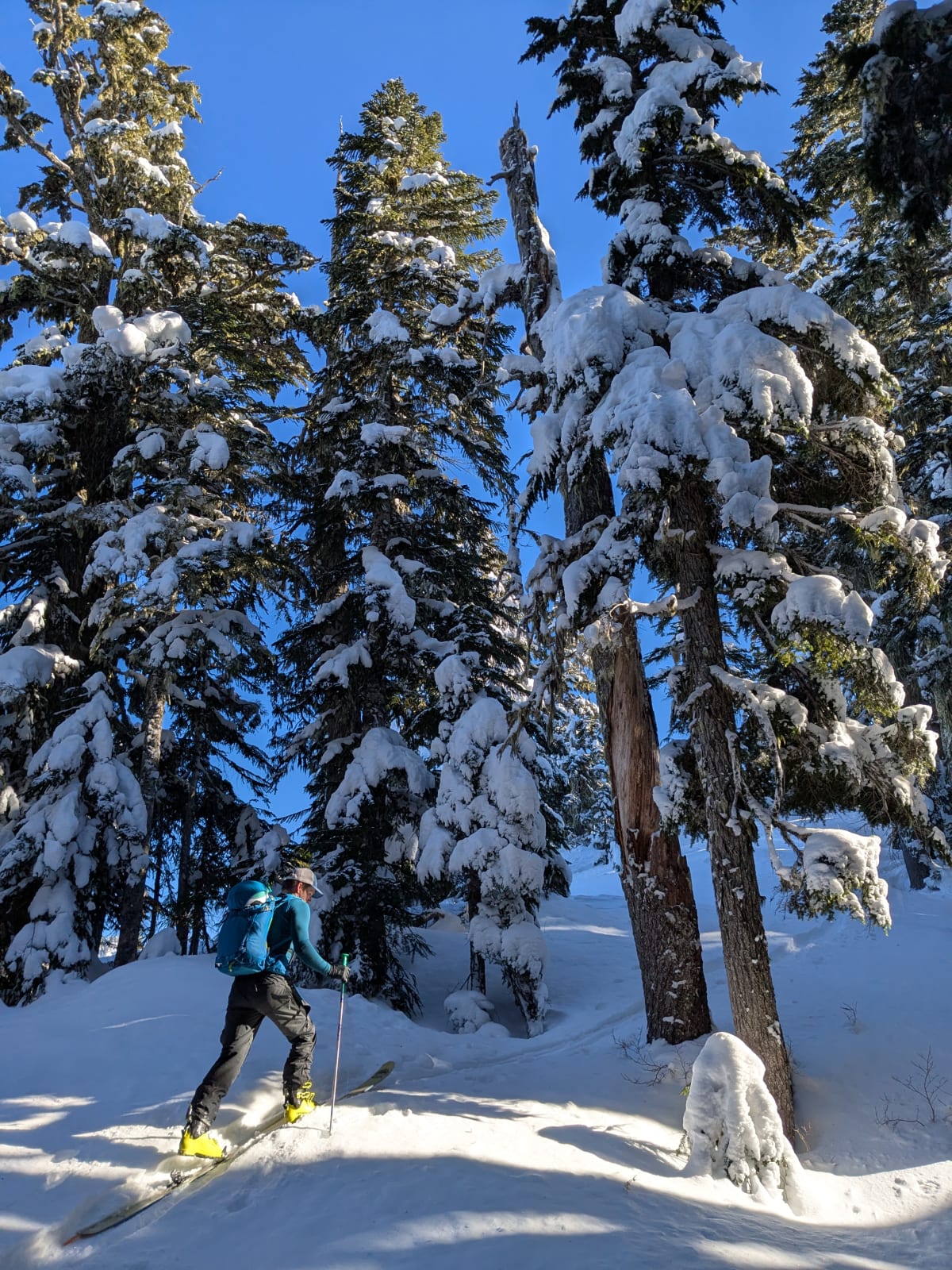 Excellent day skiing some N and NW facing treeline terrain in the Cain area. The clear, cool nights had grown some 1-2cm surface hoar that shushed beautifully on the skin towards our objective.