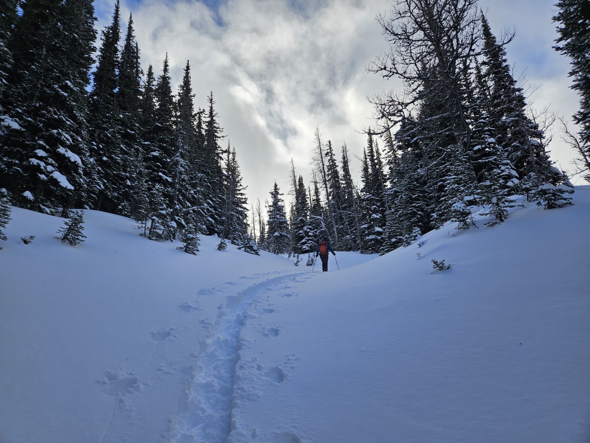 Skinned up to summit Frosty but turned back below the summit ridge as daylight was running out. Terrible trail to ski down. Great powder though.