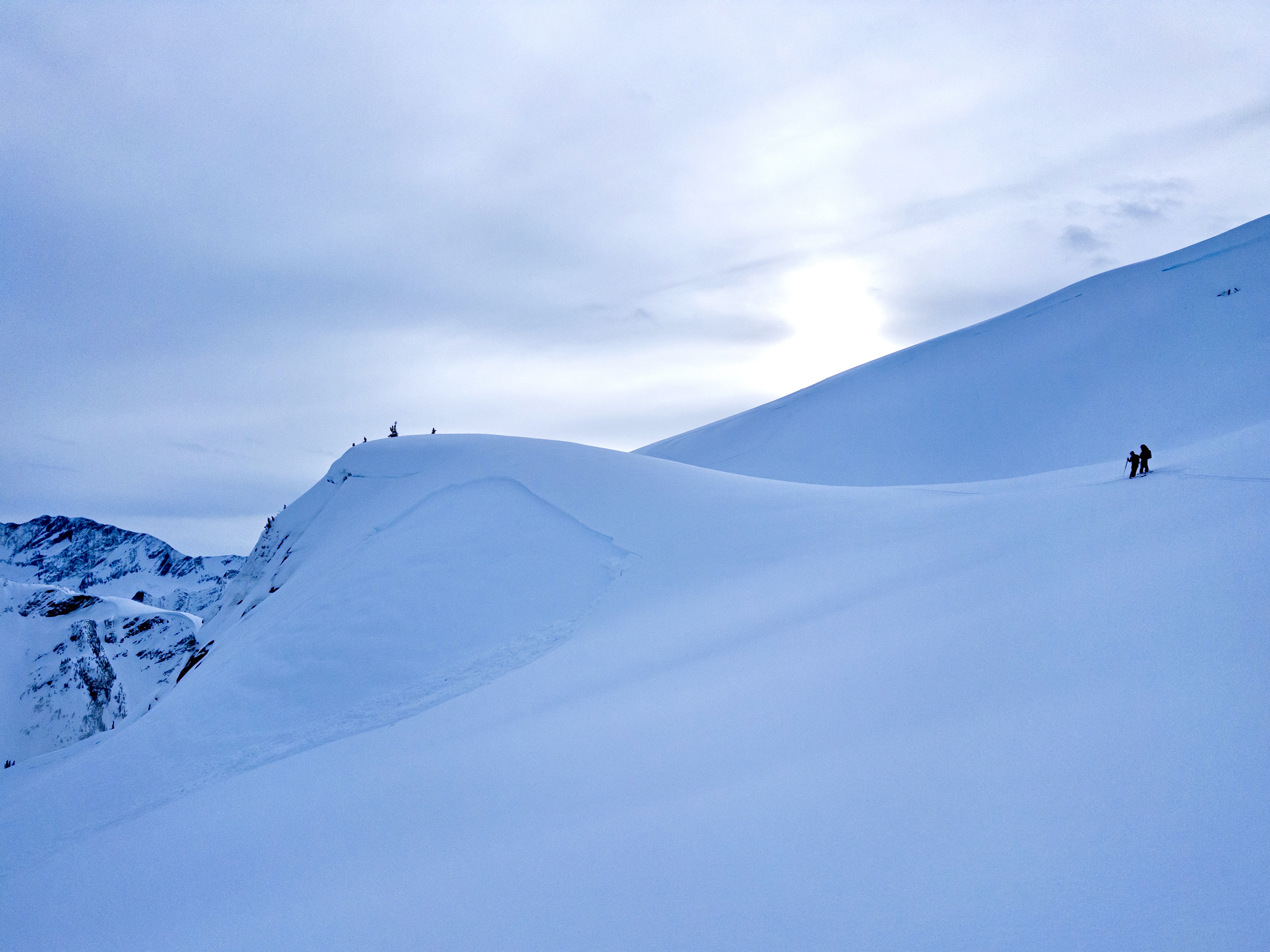 Weather for the day was warm. Close to 0 up high. Only very light wind on ridges. In and out clouds/fog but other times almost sunny but with a high thin cloud layer holding off the main energy.