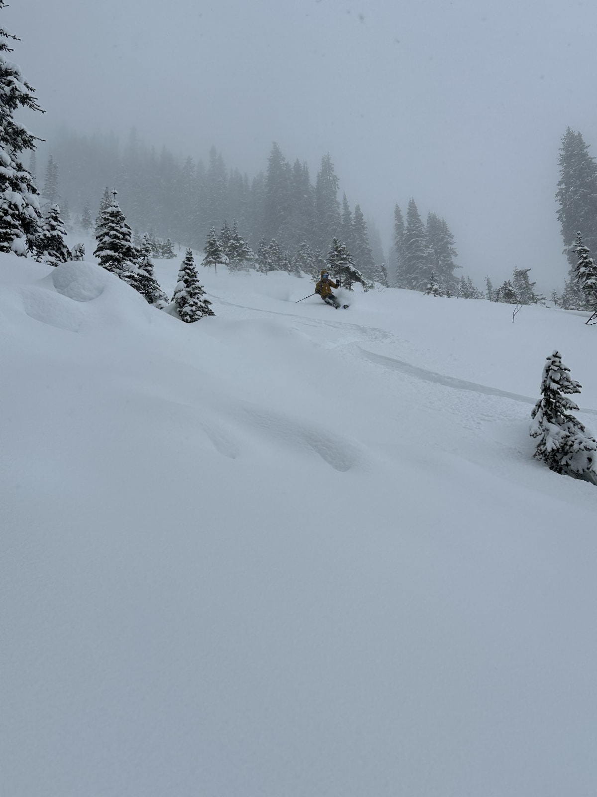 Storm skiing today in the Tumbling NE5 area. Not much snowpack at road level but increased to 115cm by 1900m. Steady snowfall all day. Gusty winds. Deep powder and great skiing above ~1600m, below was heavy. Touchy avalanche conditions closer to treeline!