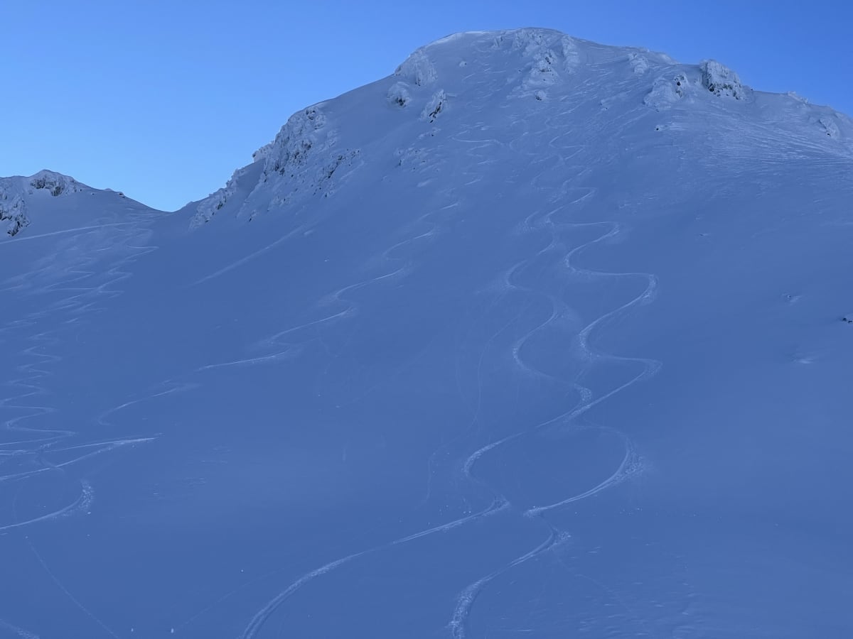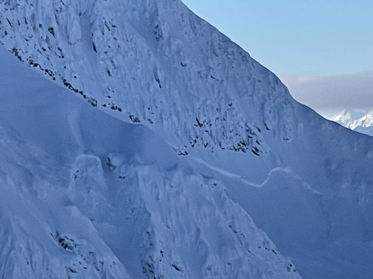 A tale of two elevation bands out there right now. TL and below has a very shallow snowpack capped with a thick crust and about 5cm of fresh powder. At these elevations there really isn't much opportunity to ride beyond linking snow corridors to higher elevations. The alpine is a different story. The crust disappears at around 1200m and things are starting to fill in. Snowpack depth is variable but sheltered, planar features have 75-150cm of well settled snow topped with 15-20cm of fast skiing powder. We observed one large natural avalanche on a steep north aspect that likely occurred 24-48hrs prior. The crown was up to 100cm thick and given the terrain feature this was likely a large wind slab that released during the stiff south flow that occurred a few days ago. We warmed the legs up with a mellow glacier run but felt quite confident moving into larger, steeper terrain features with careful assessment and some ski cutting. Ski cutting produced only minor sluffing. Great riding and a bit of sun in December!!!