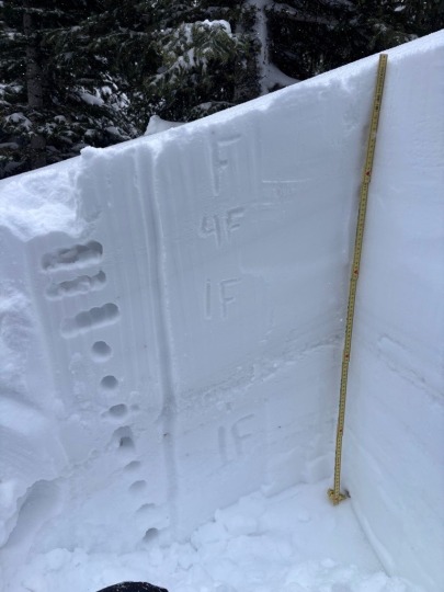At 1:00 pm we were at 2100 m. It was -2, snowing lightly, and the wind was moderate with strong gusts from the W/NW. We dug 2 profiles, one on a south aspect and one on a north aspect. Much like yesterday (see our min from Crown Mountain) we were getting settlement and whumpfing as soon as we stepped off trail. Whumpfing typically signals a collapse of a weak layer in the snow - so we knew without even seeing it, that the persistent weak layer was present.
