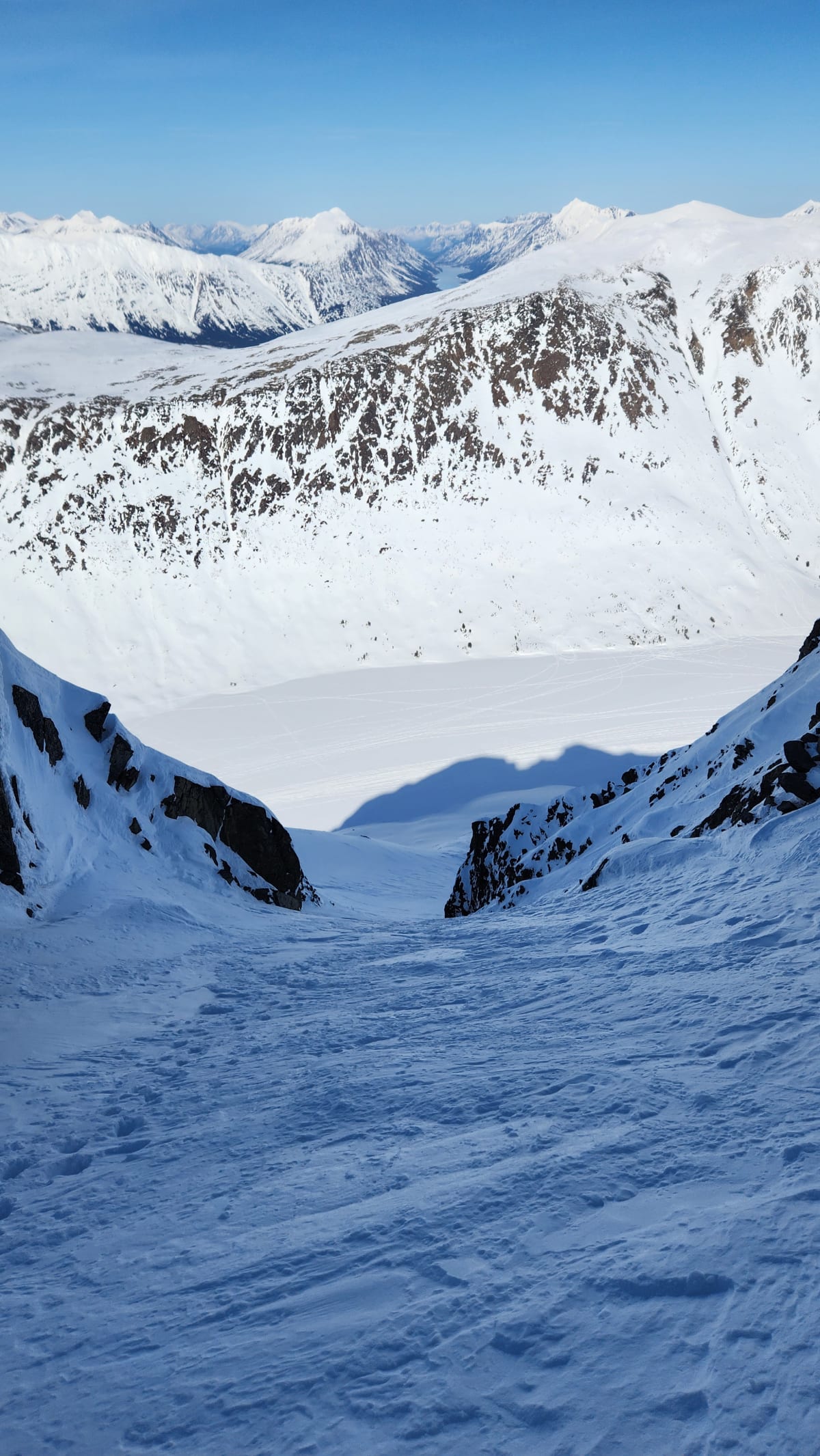 We skied the north couloir on Fraser Peak. Great day out despite pretty average snow conditions. No signs of instability. Relatively good snow at the top of the couloir quickly became quite wind affected lower down.