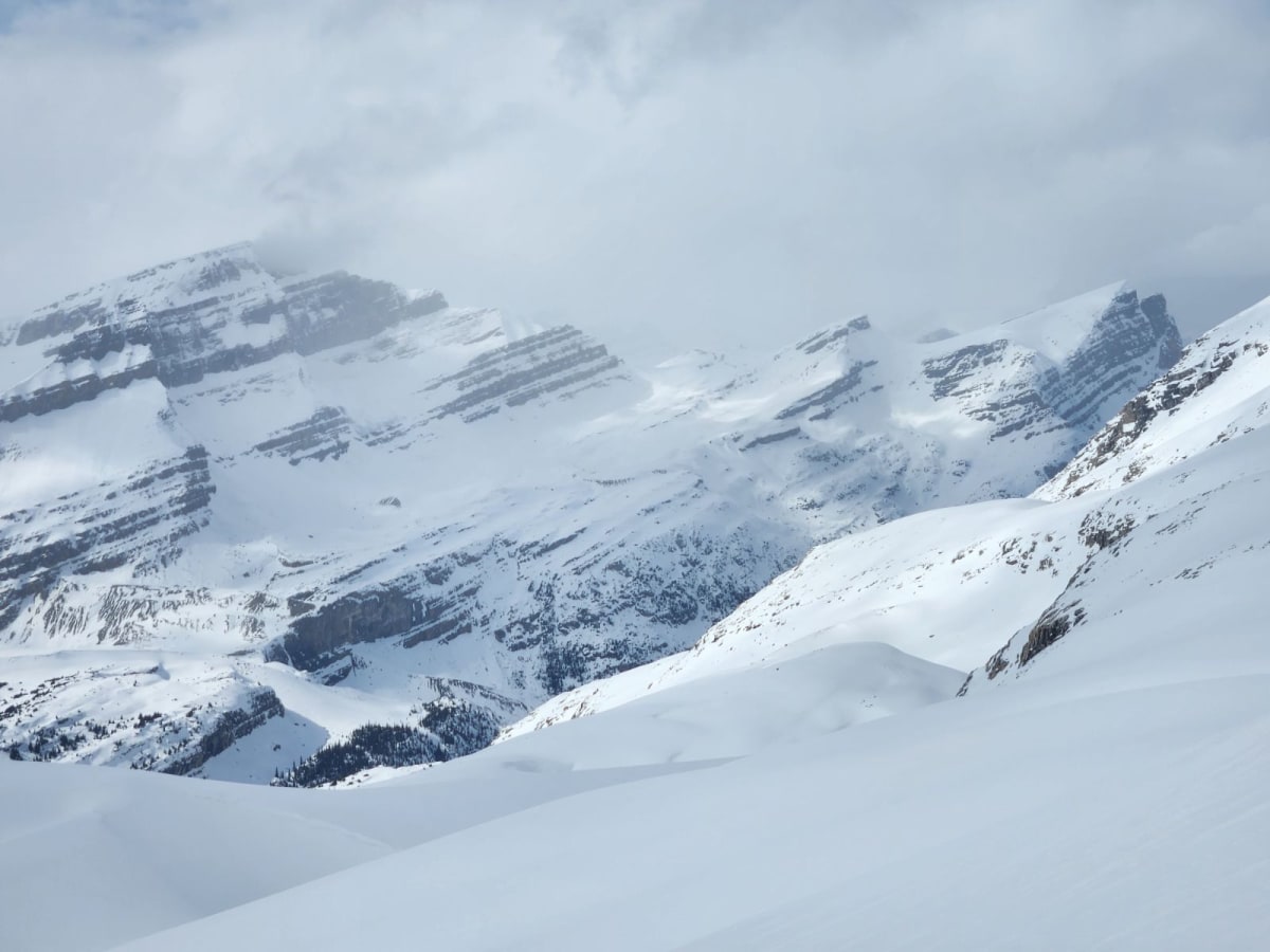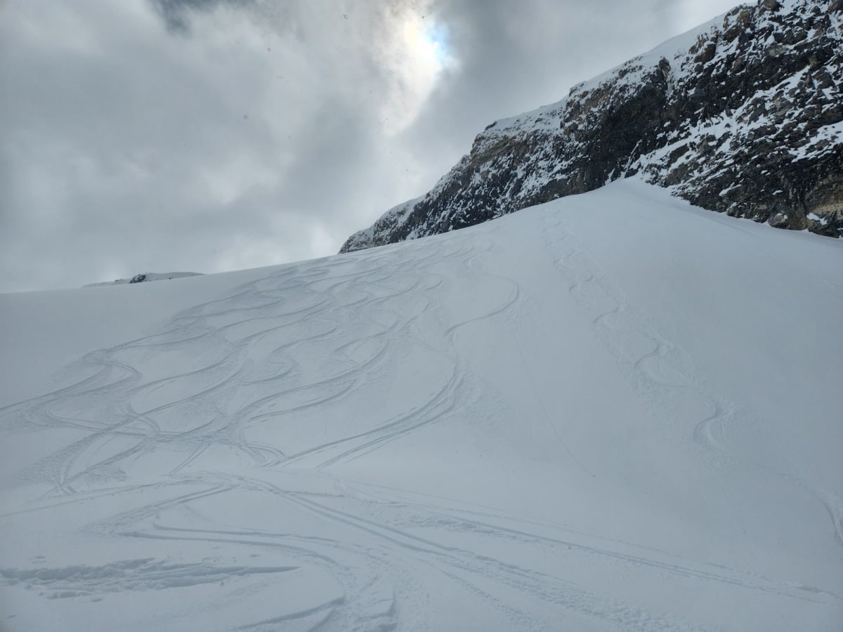 Good coverage in the creek and the lake is still in great shape. Crusty skinning to base of glacier but great pow on the glacier with a base of 200cm. Down drafting winds in the morning off the glacier but light to moderate Ne winds. Sun came out for 30 minutes and softened up the snow on the south side of little crowfoot. Remote triggered a temperature slab on a south east facing slope 10-15 cm deep and 30m by 30m, 50m away at 2600m. Good snow on due N above 2500m and protected North above 2400m. The 93N didn't get many of the upslope storms and the east side of the highway was looking boney.