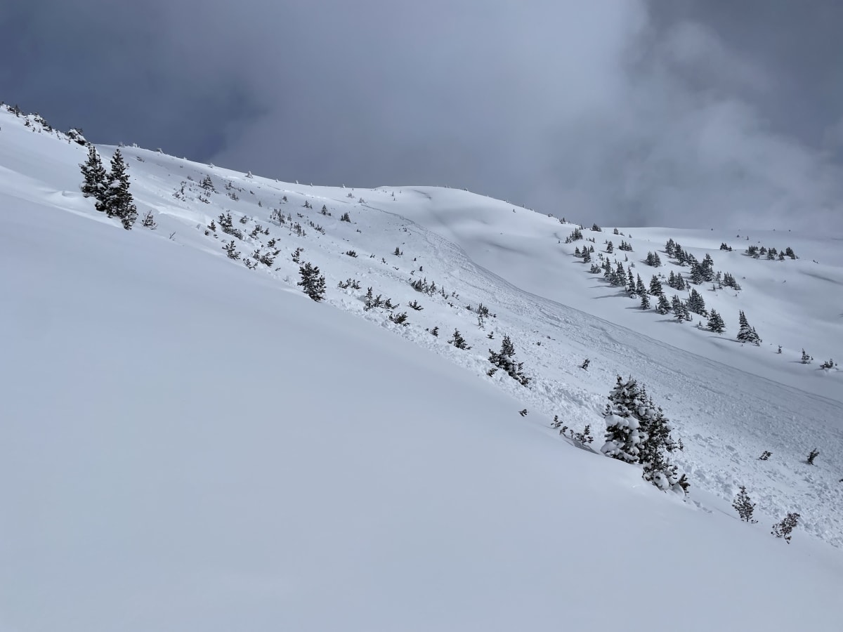 Skied along ridge into half moon along treed edge of slide path. Walking out on ridge sun was picking up heard slope release and watched it go. Slow moving till it hit the choke. Big powder cloud, ran all the way.