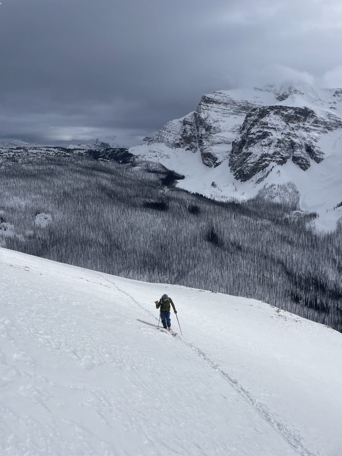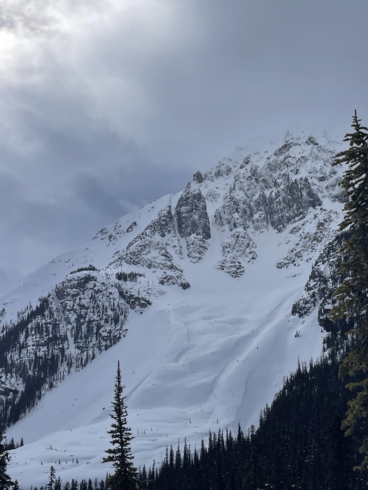We chose to ascend the S,SW slope in the burnt trees. Certainly kept in mind the multiple Sz 2/2.5 avalanches that we were seeing from other MINs. As we wrapped around onto the S aspects, a Sz 2.5/3 had run to valley bottom, (3-5days old). This had run down to ground.