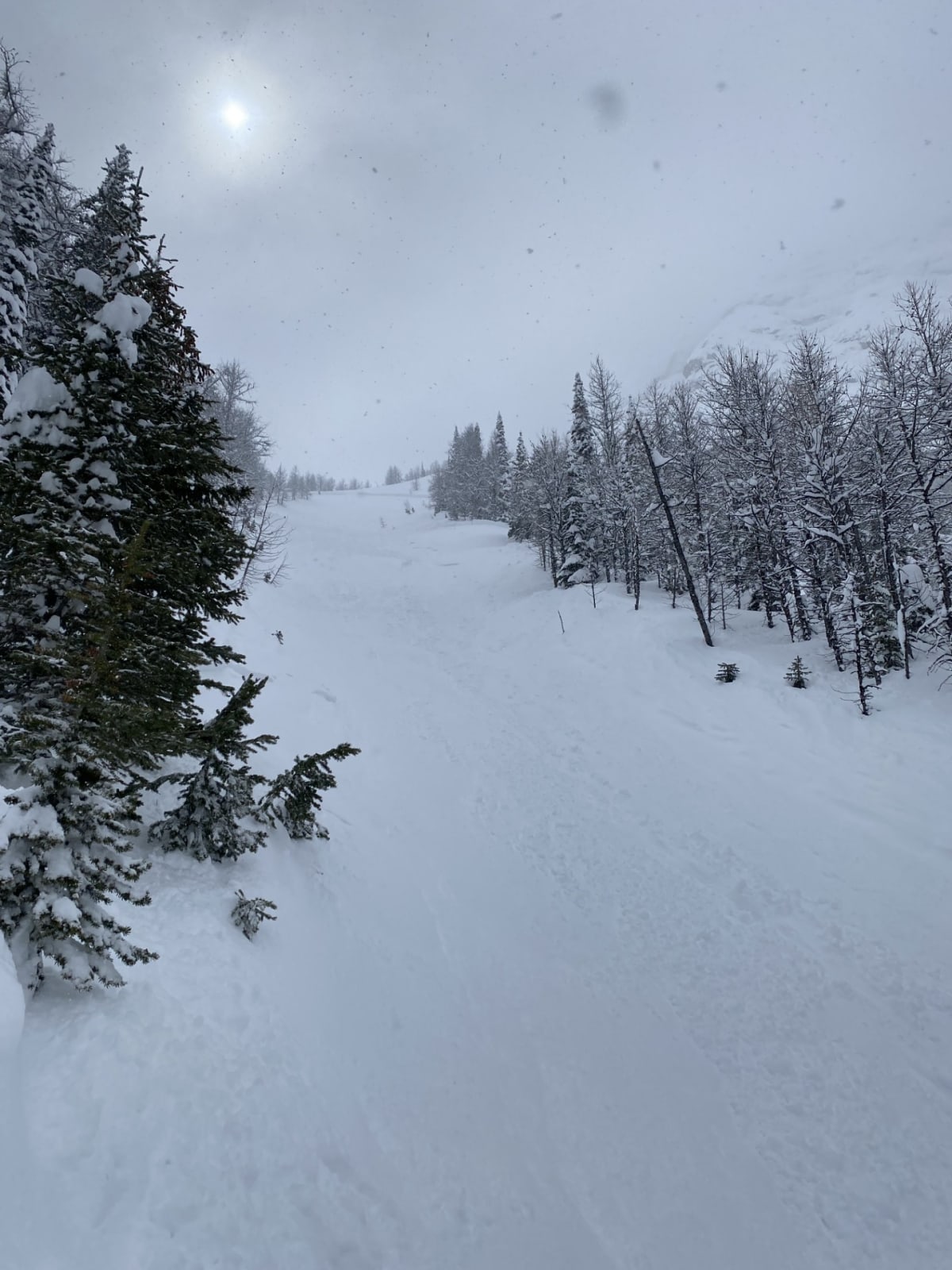 We skied to a ridge crest at treeline, up tracking in the safe trees. Our plan was to ski down the mellow shoulder and back into the trees avoiding a large steep start zone on our left. As we descended the ridge the first skier triggered the avalanche, but stayed high and skied safely into the trees. Profile dug near the slope (N aspect at 2250m) showed 75cm HST overlying a thin crust. Density above crust was mostly F, with 4F at bottom 20cm. Compression test hard RP x2.