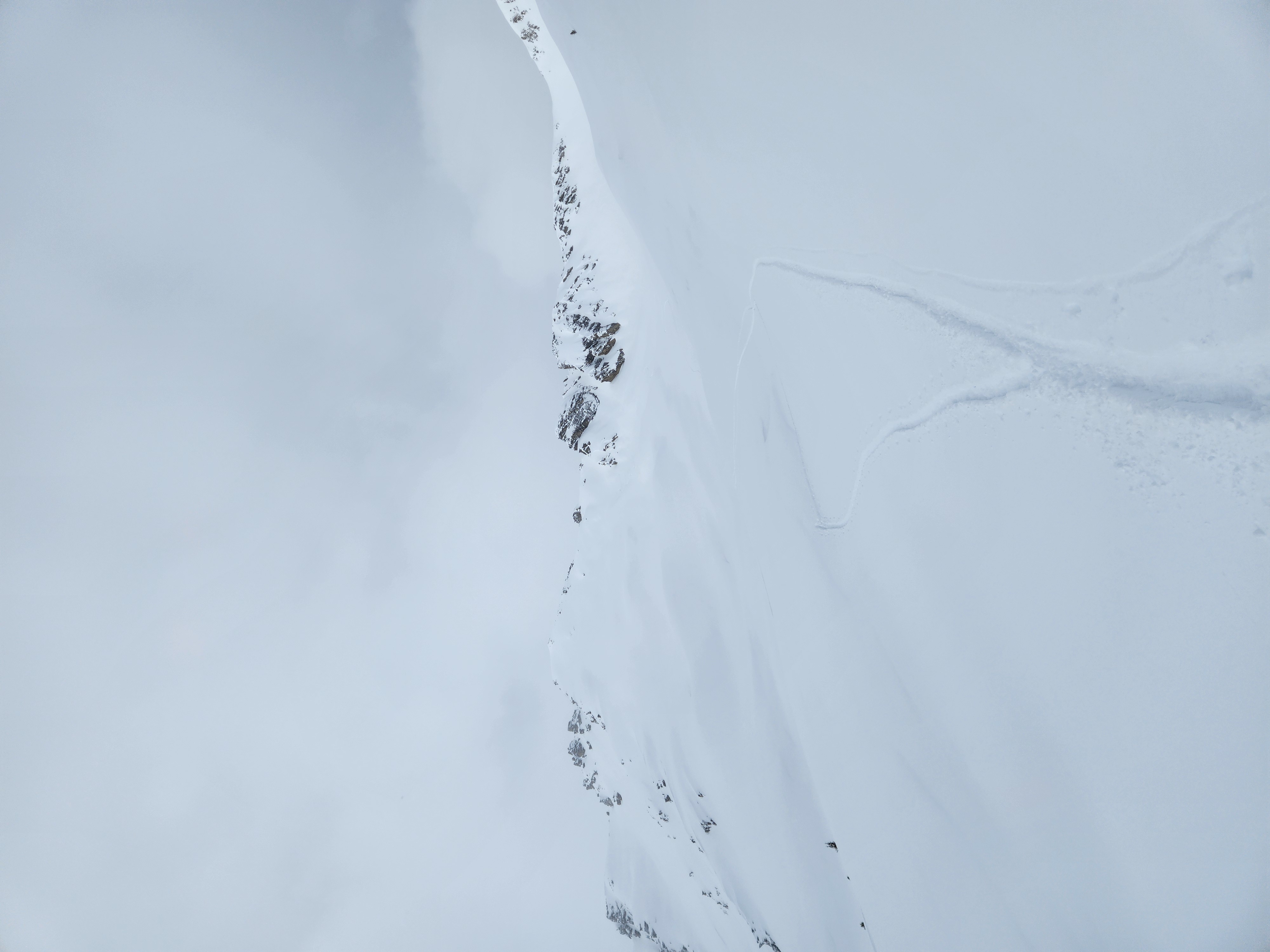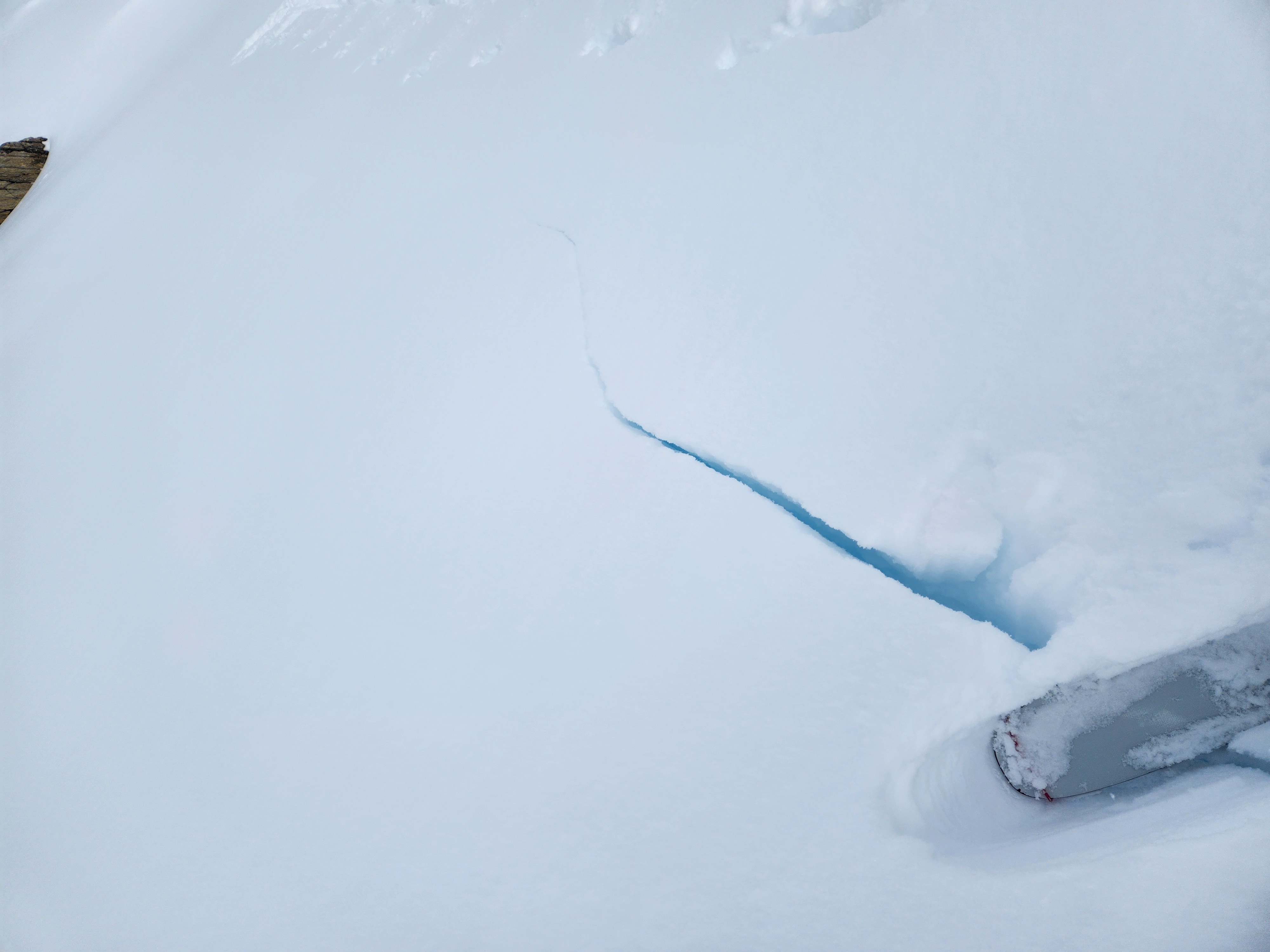 Encountered cracking of a 50-70cm deep slab when unsupported while skinning up the lookers right side of video. Turned around where slope angle increased at 2450m after 5m crack propagation shown in photo. Judged it too sketchy for solo travel.