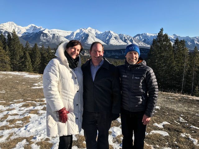 Banff Mayor Karen Sorenson, Cameron Westhead, MLA for Banff-Cochrane, and Gilles Valade, Executive Director of Avalanche Canada at a chilly but scenic news conference in Banff, January 26.