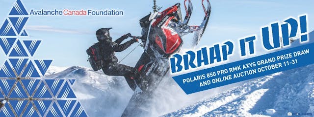 The Avalanche Canada Foundation has launched Braap it UP!, its first online fundraiser geared towards the snowmobiling community. This fundraiser includes an online auction with over $10,000 in prizes, and a prize draw where the grand prize is a brand new Polaris snowmobile!