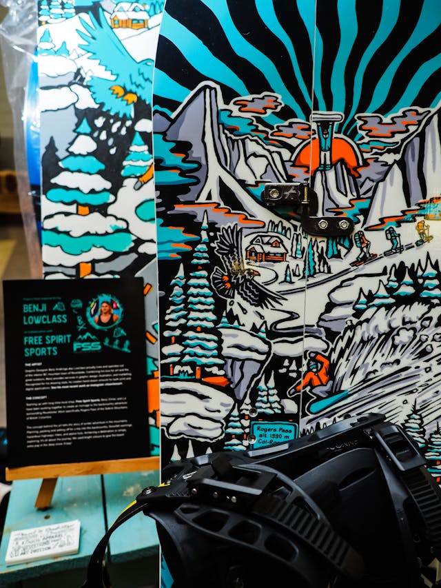 Photo: Prior's custom top sheet, featuring artwork by local Revelstoke artist Benji Andringa of Low Class Art at the Free Spirit Sports booth. By Alex Cooper